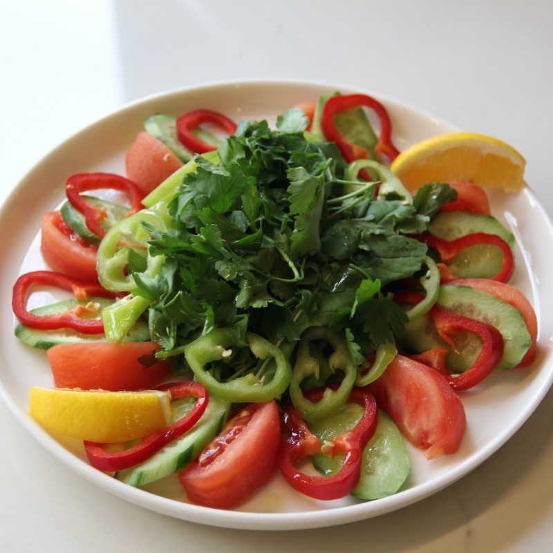 Köy domatesi, badem salatalık, köy biberi, roka, maydanoz