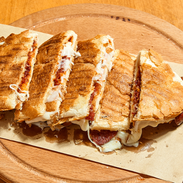 Kaşar peyniri, sucuk, jambon, domates sos, ekşi mayalı ekmek, domates, salatalık, siyah zeytin