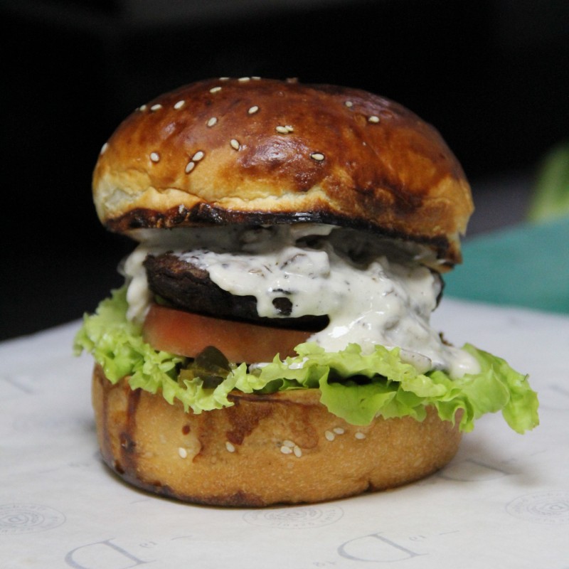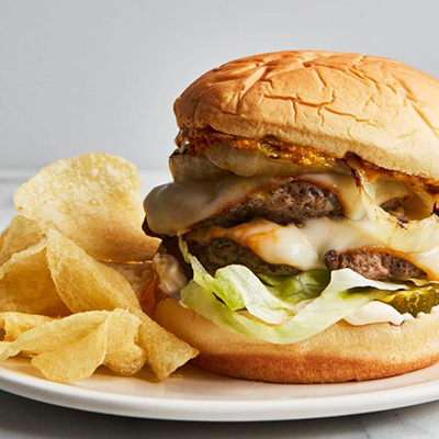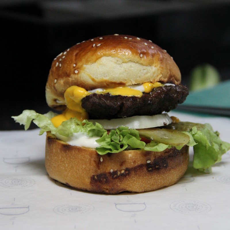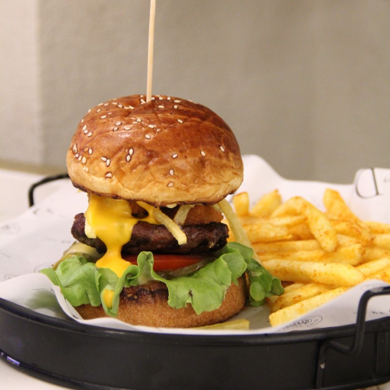 El yapımı burger köftesi, özel sos, domates, marul, kornişon turşu, karamelize soğan, Cheddar peyniri,sarımsaklı mayonez, kaşık patates