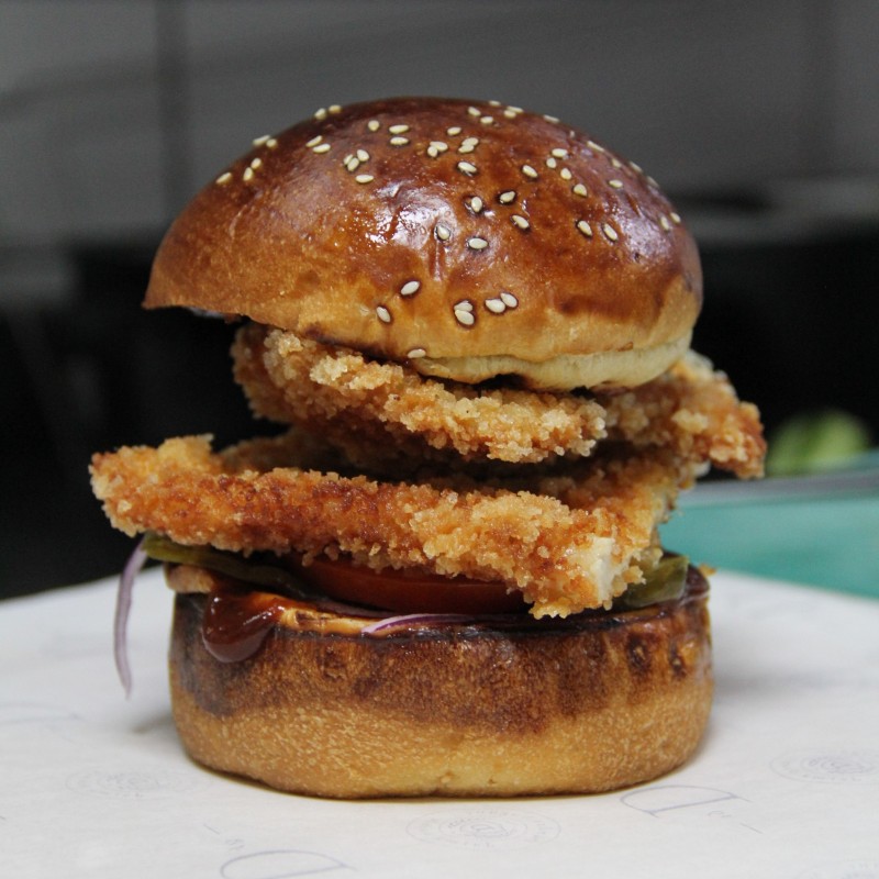 Pane tavuk göğüs, barbekü sos, kırmızı soğan, marul, kaşık patates