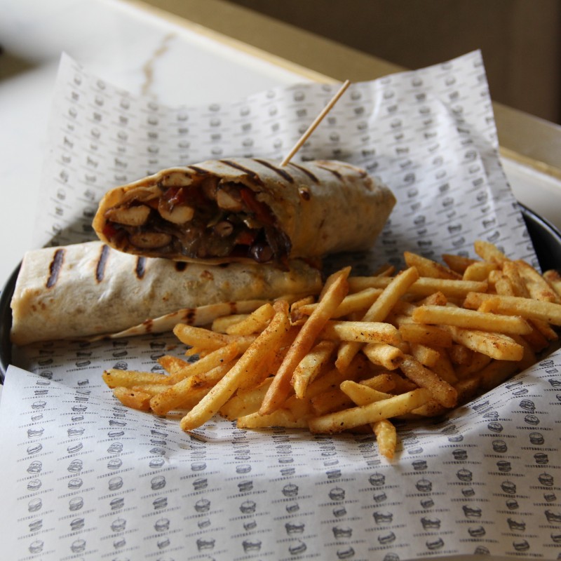 Izgara piliç göğüs, soğan, renkli biber, Meksika fasülyesi, mantar, cheddar peyniri, parmak patates,