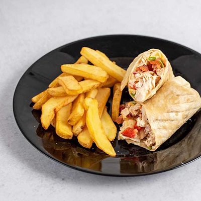 Cajun Tavuk, tortilla ekmeği, kıvırcık, mısır, isli mayonez, domates, parmak patates