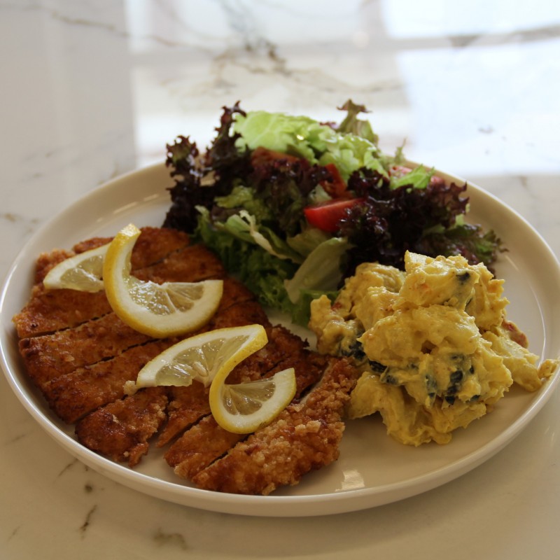 Panelenmiş piliç göğsü, baharatlı tereyağ, ılık patates salatası