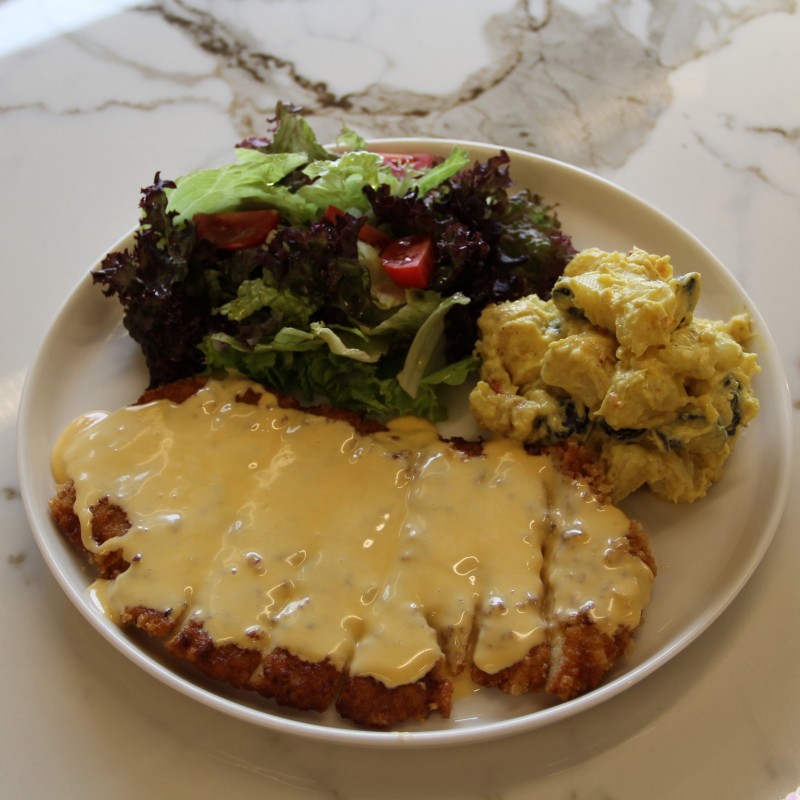 Panelenmiş piliç göğsü, cheddar peyniri, baharatlı tereyağ, ılık patates salatası