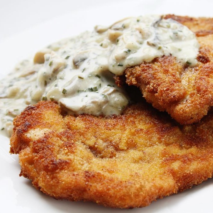 Panelenmiş piliç göğüsü, mantarlı sos, baharatlı tereyağ, ılık patates salatası